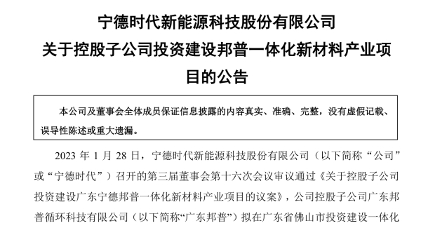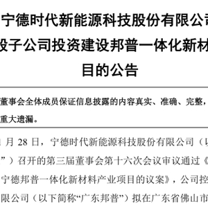 2023年1月30日,宁德时代新能源科技股份有限公司(以下简称“宁德时代”)发布公告称,拟由控股子公司广东邦普循环科技有限公司(以下简称“广东邦普”)在广东省佛山市投资建设一体化新材料产业项目,项目投资总金额不超过人民币238亿元。资金来源为自有或自筹。