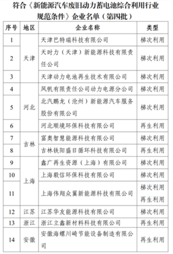 2018年7月,工信部公布了第一批符合“新能源汽车废旧动力蓄电池综合利用行业规范条件”的名单,包括华友循环、豪鹏科技、格林美、邦普循环、光华科技 5 家企业。2022年11月16日,工信部就第四批名单公开征求意见,该批次共计41家,至此入选动力电池回收白名单的企业总计88家。