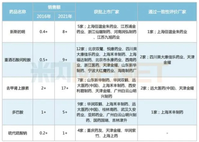 以去甲肾上腺素为例,销售额从2016年的2亿多提升至2021年的17亿多,虽然获批生产厂商看似很多,但远大医药是唯二通过一致性评价的生产厂商。