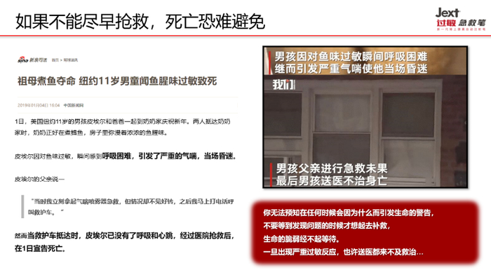 2019年1月,美国纽约的一名11岁男童因闻到奶奶家里的鱼腥味而过敏,瞬间出现呼吸困难并引发严重气喘随后昏迷,其父亲急救未果,最终男孩不治身亡。该案例充分说明了严重过敏反应对于潜在中高风险人群往往是突发性的,而如果未能用合适的急救用品或者急救不及时,对患者造成的后果也将是致命性的。