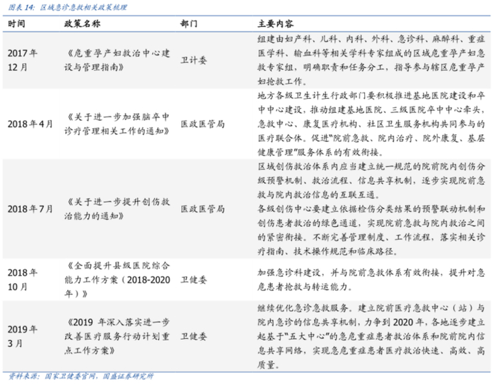 如2019年卫健委陆续印发胸痛中心、卒中中心、创伤中心、危重孕产妇救治中心、危重儿童和新生儿救治中心“五大中心”的建设,同年亦对急救管理的政策法规、加强急救体系建设提出更高要求。