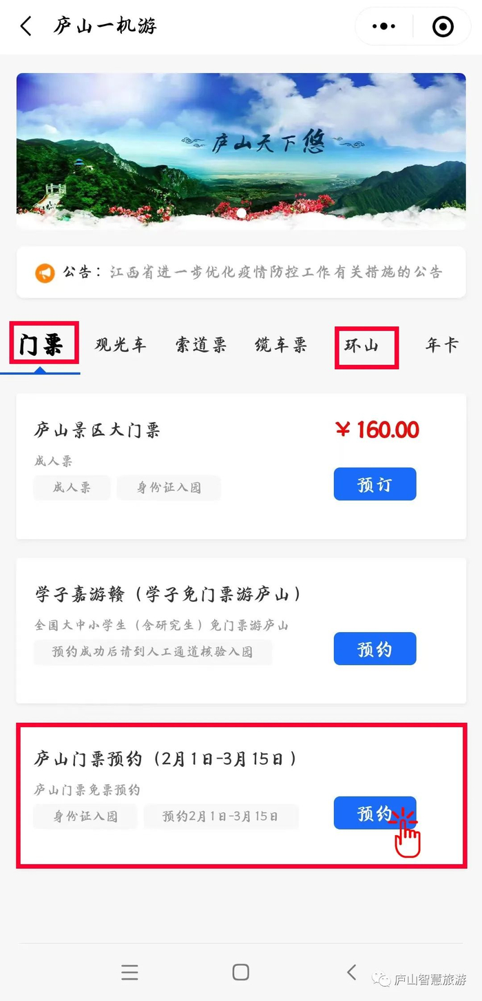 景区严格落实“限量、预约、错峰”要求,请广大游客提前登录“庐山一机游”微信或支付宝小程序,进行线上实名预约,特殊人群可到景区售票处进行登记。
