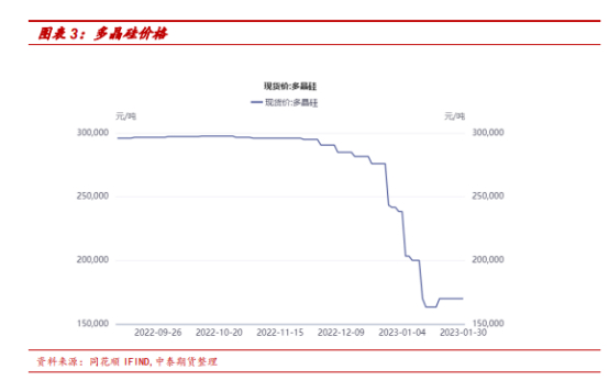 多晶硅方面,多晶硅整体价格保持稳定。据SMM统计,1月30日多晶硅复投料报价190元/千克;多晶硅致密料180/千克;多晶硅菜花料报价165元/千克;12月光伏行业预期好转,整个光伏产业链产品价格反弹。多晶硅企业春节期间开工正常,硅料总库存小幅上涨。硅片价格近期下行,有助于终端光伏装机提升,提振工业硅需求。