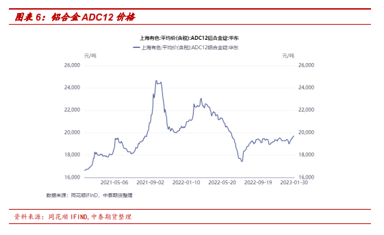 铝合金方面,春节前铝合金价格持续反弹。根据SMM统计,截至2023年1月20日,铝合金锭SMM A00铝18980元/吨,A356铝合金锭20150元/吨,ADC12铝合金19700元/吨。铝合金行业受终端市场影响整体供需两弱,开工率不高。再生铝厂复工时间集中于正月初八或初十,因此预计短期再生铝合金开工率保持低位。此外,中国汽车工业协会发布汽车产销数据显示,2022年12月汽车产销分别达到238.3万辆和255.6万辆,环比分别下降0.3%和增长9.7%,同比分别下降18.2%和8.4%。2022年1-12月,汽车产销分别完成2702.1万辆和2686.4万辆,同比增长3.4%和2.1%。汽车行业整体的回暖使铝合金的需求一定程度上提升,价格小幅度反弹。
