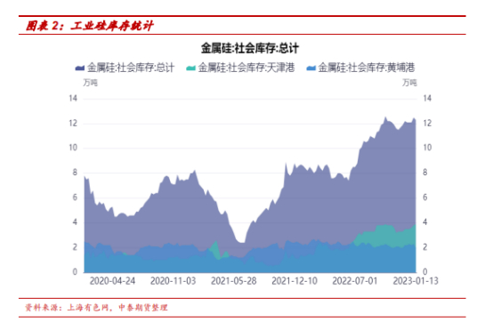 库存小幅增加。根据SMM数据统计显示,1月28日工业硅三地社会库存共计12.5万吨,较上周增加0.2万吨,主要与春节期间运输受到影响有关。其中,黄埔港库存2万吨,昆明库存6.5万吨,天津港库存4万吨。据百川盈孚统计,截止1月27日,中国金属硅行业库存合计23.93万吨,较上周增加1.65万吨;其中百川统计厂库12.13万吨,增加1.65万吨。