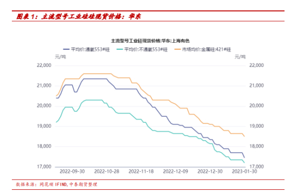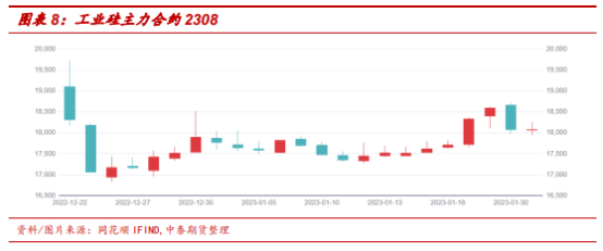 工业硅现货价格方面,近期维持下跌走势。主要是因为三大下游需求总体疲软且库存维持高位。工业硅现货价格逐渐靠近成本线,下跌幅度有限。节后随着宏观经济修复预期,下游需求量或将逐渐增加,工业硅现货价格有望迎来反弹。期货方面,节前期货价格盘面提前拉升,或将反映春节后需求提升预期。后续看来,当下短期期货价格将维持震荡走势。远期看来,利好政策频出,市场对地产、基建等终端消费存在经济复苏预期,提振下游需求,期货价格存在向上潜力。