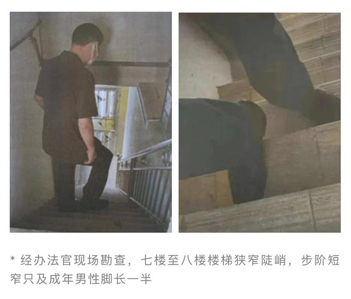经现场勘查,涉案房屋一至七楼楼梯基本一致,跨步高度约160mm,跨步宽度约275mm;七楼至八楼楼梯更陡峭,跨步高度约170mm,跨步宽度约190mm,楼梯两侧均为墙面,其中一侧墙面上安装有不锈钢扶手(涉案事故发生时七楼至八楼的楼梯扶手被张先生拆除)。