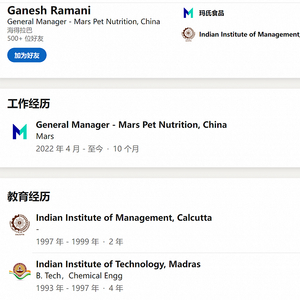 日前,工商资料显示,玛氏宠物食品(中国)有限公司负责人变更为“Ganesh Ramani”,这使得该公司的高层人事变动进入了公众视野。小食代了解到,任嘉实(Ganesh Ramani)自2022年4月起已接替牛英华,正式出任玛氏宠物营养中国总经理,后者已于2022年3月离开玛氏。