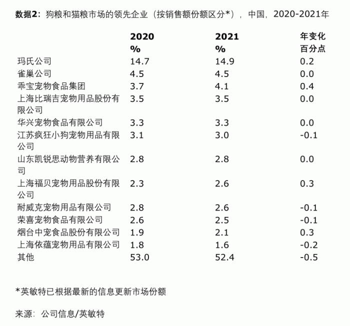 目前,在宠物猫犬食品这一赛道,玛氏中国稳坐头把交椅。小食代拿到的英敏特数据显示,2021年,按照以销售额份额计算的市场份额,中国狗粮和猫粮市场上的“三巨头”分别是玛氏(14.9%)、雀巢(4.5%)和乖宝宠物食品集团(4.1%)。
