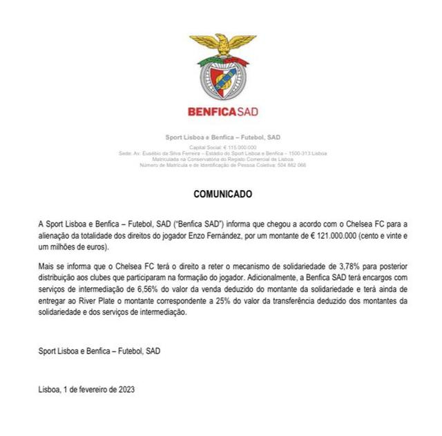 本菲卡俱乐部在公告中详细介绍了转会费的分配情况。切尔西俱乐部将保留其中的3.78%(约457万欧元),这笔钱将在未来分配给培养过费尔南德斯的各俱乐部;转会费的6.56%(约794万欧元)为中介费;转会费的25%(约3025万欧元)将是本菲卡俱乐部支付给费尔南德斯前东家河床俱乐部的二次转会分成。