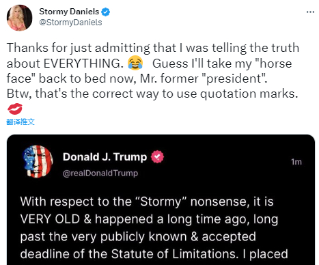 特朗普的言论很快引来了斯托米·丹尼尔斯的嘲讽。她在推特上写道,“谢谢你刚刚承认我说的每件事都是真的。我认为,我现在要带着我这张‘马脸’回去睡觉了,前‘总统’先生”。《新闻周刊》提到,特朗普此前侮辱丹尼尔斯,多次说她是“马脸”。