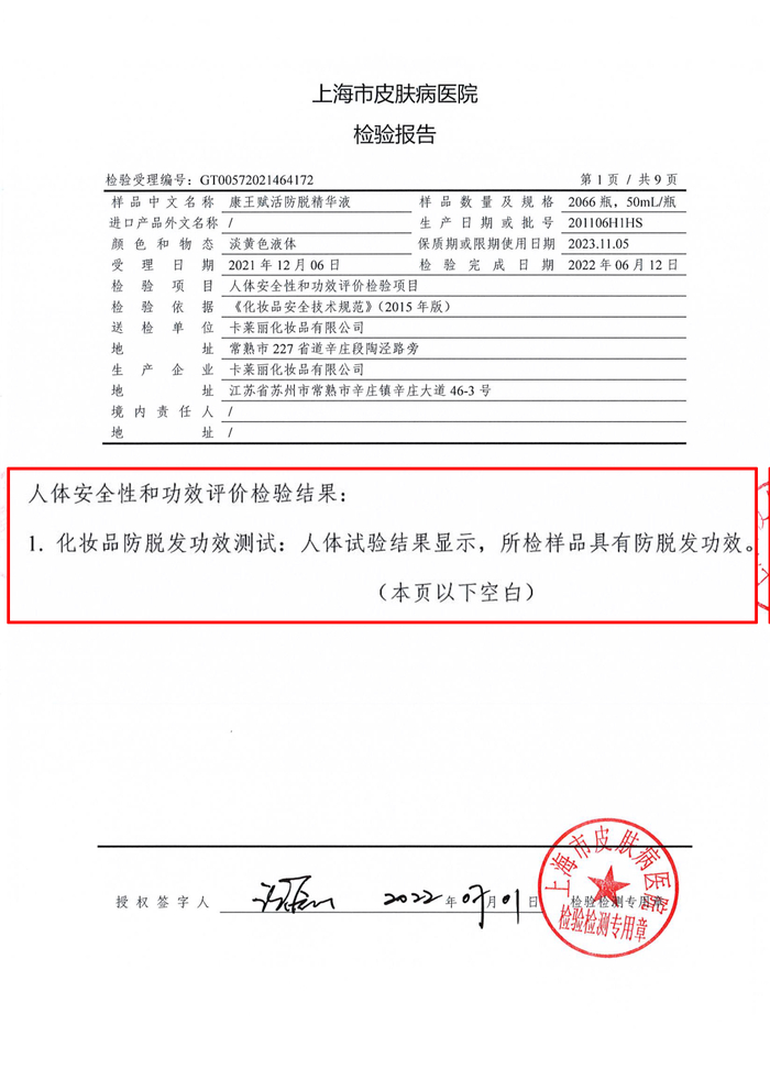 根据三甲上海市皮肤病医院出具的人体功效试验报告,67 位受试者分为两组(36 例试验组,31 例对照组),显示试验组使用拜耳康王赋活防脱精华液后,受试者脱发计数相较于使用前有显著性改善。