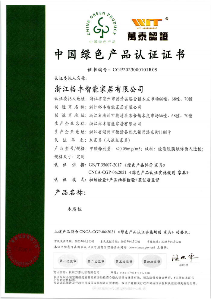 近日,兔宝宝定制柜产品获“中国绿色产品”认证。
