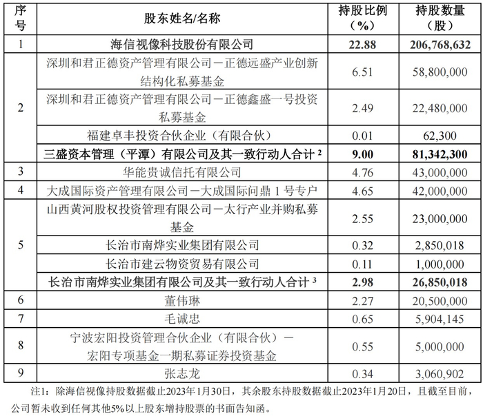 此后,海信视像又多次在二级市场增持。截至2023年1月31日,海信视像累计已投资乾照光电的金额为16.05亿元,持有乾照光电2.07亿股,占乾照光电总股本的22.88%。