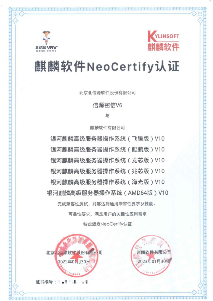 1月30日,北信源“信源密信V6”与麒麟软件“银河麒麟V10”正式完成兼容性测试。测试结果显示,“信源密信V6”在国产操作系统上运行稳定,产品能够达到通用兼容性要求及性能、可靠性要求,满足用户的关键性应用需求,获颁麒麟软件NeoCertify认证证书。
