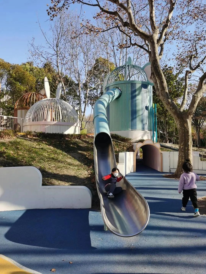 最近,园内还新增了一条“网红”毛毛虫滑梯,如同巨龙盘踞在辰山脚下,孩子们可以从半山腰直接滑到山脚下,特别刺激。
