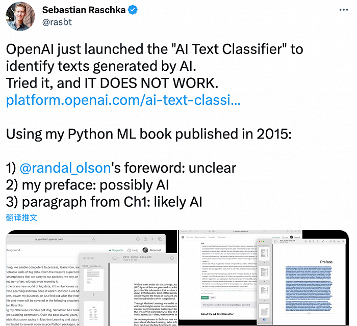 Sebastian Raschka还从自己在2015年出版的Python ML书摘录了好几段,AI文本分类器的识别也不是很准,Randy Olson的前言部分被识别成“不清楚是否由AI生成”,他自己写的前言部分被识别成“可能是AI生成的”,第一章部分被识别成“很可能是AI生成的”。