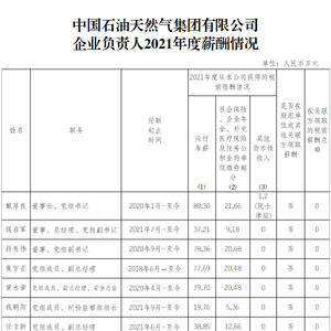 1月31日,中国石油天然气集团有限公司在网站公布企业负责人薪酬信息。中国石油天然气集团有限公司董事长、党组书记戴厚良2021年度从该公司获得的税前应付年薪为89.30万元。