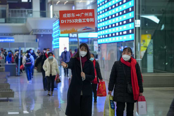 2月1日上午9点30分,600余名四川籍务工人员分别从成都东站、乐山站和宜宾西站出发,搭乘D1753次列车,“拼车”前往广东务工。这趟由成都东站开往广州南站的务工专列采取的是“沿线接站”的模式,即务工人员就近上车。例如,遂宁和成都的旅客在成都东上车,乐山和眉山的旅客在乐山站上车,宜宾和泸州的旅客在宜宾西站上车,减少中转距离,方便旅客出行。