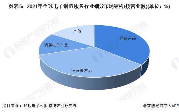 从细分市场份额来看,2021年,全球电子制造服务市场营业收入排名前三的产品类别分别为:通信产品、计算机产品和消费电子产品,其中通信产品的占比最大,通信产品和计算机产品市场的营收占比份额均超过三成。