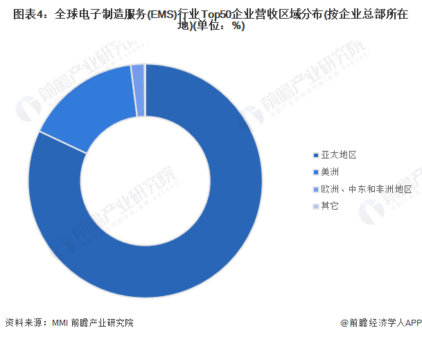 从行业企业营收TOP50的区域分布来看,亚太地区占全球电子制造服务(EMS)前50名收入的80%以上,美洲占比不足20%,EMEA(中东、非洲和欧洲)地区占比不足2%。亚洲地区的电子制造服务(EMS)行业发展占据重要地位。