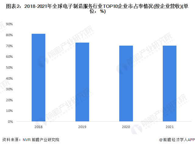全球电子制造服务行业生产厂商众多,属于充分竞争行业,而行业内龙头企业积累了丰富的客户资源和行业经验,资产和营收规模大,保持相对稳定的领先地位,市场整体高度集中。根据NVR数据,2017-2021年,全球排名前10的EMS厂商EMS收入占整个市场的比重呈现下降态势,但2021年的占比仍然有七成左右,行业集中度始终处于较高水平。