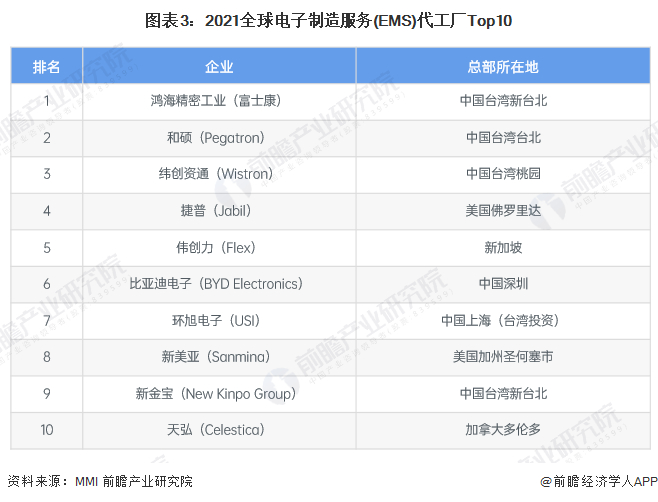 2022年4月,全球权威研究机构MMI发布了《2021年全球EMS(电子制造服务)代工厂50强榜单》,鸿海精密工业(富士康)、和硕、纬创资通、捷普、伟创力等位居前列,前十企业名单如下: