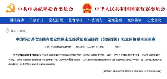 据中国移动通信集团有限公司纪检监察组、北京市纪委监委消息:日前,经中央纪委国家监委批准,中国移动通信集团有限公司纪检监察组、北京市昌平区监察委员会对中国移动通信集团有限公司在线营销服务中心原党委书记、总经理陆文昌严重违纪违法问题进行了纪律审查和监察调查。