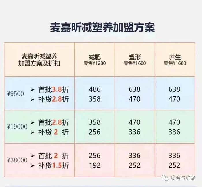 加盟有9500元、19000元、38000元三种方案,首次进货按照9500元方案,首次进货3.8折,补货2.8折(原价1680元);