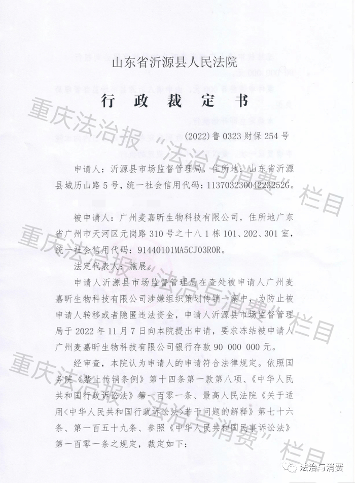 近日,据知情人透露,广州麦嘉昕生物科技有限公司因涉嫌传销被山东省沂源县人民法院冻结账户。随后,重庆法治报《法治与消费》栏目向相关部门核实有关情况。