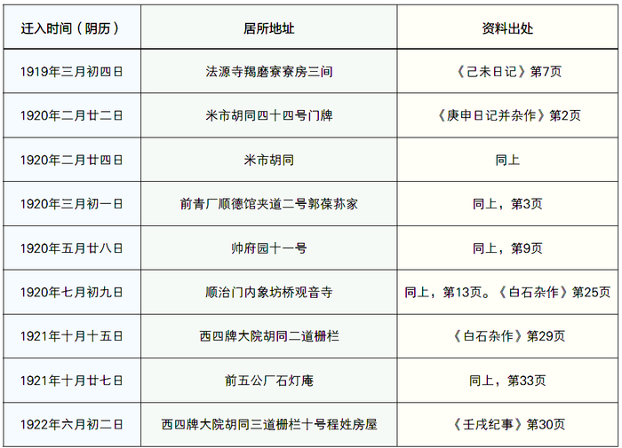 笔者根据北京画院藏齐白石日记手稿,整理出齐白石1919—1922年在北京居所情况如下: