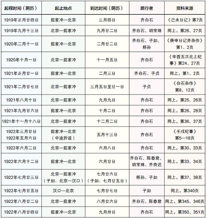 笔者根据齐白石日记手稿,整理出齐白石及亲人1919—1922年间往返北京与湖南湘潭茹家冲老家之间的行程情况。