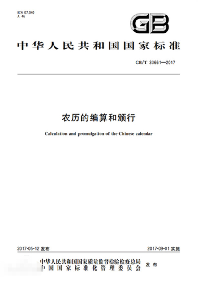 2017年5月23日,国家质检总局、国家标准委发布了334项国家标准,其中包括《农历的编算和颁行》。