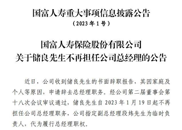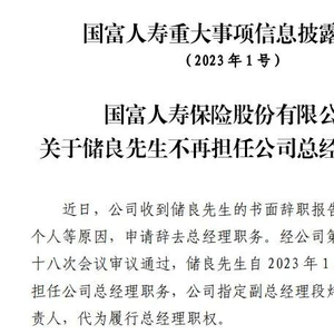 近日,国富人寿发布公告称,储良因家庭及个人等原因申请辞去总经理职务。经公司第二届董事会第十八次会议审议通过,储良自2023年1月19日起不再担任公司总经理职务,公司指定副总经理段炜为临时负责人,代为履行总经理职权。