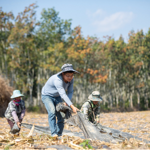 一位名叫“熊杰”的年轻人头戴草帽、弯着腰,正在一块收割完玉米的空地上,跟几位傣族工人一起清理地膜。