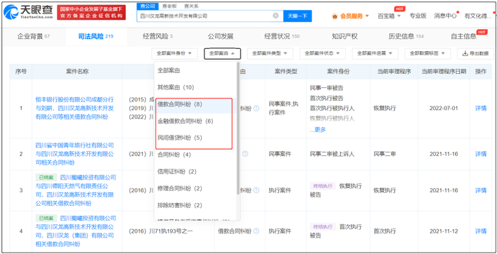 以汉龙高新为例,该公司涉及数十条法律诉讼信息,案由多为借款合同纠纷、金融借款合同纠纷等。