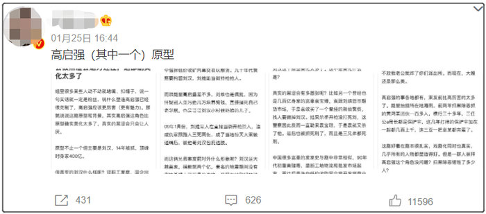 在微博上有一条高赞的内容,其中写到:高启强的角色原型不止一个,但主要是刘汉,于14年被抓,顶峰时身家400亿。