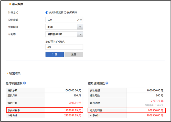 选择等额本金的还款方式,30年的利息约为90.25万,稍稍低于本金。