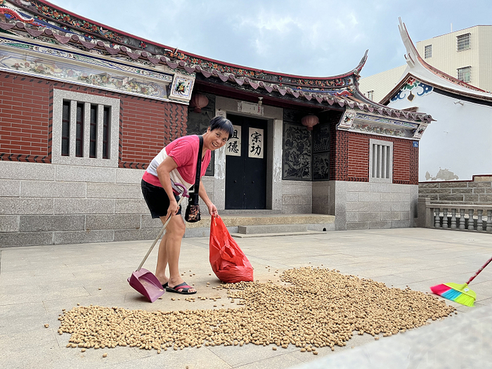 宗祠戏台前的广场是大社居民的聚集地,戏台不时有免费演出,平日里随处可见拿着自家小马扎散坐闲聊的居民,节日期间则是重要的活动举办地。妇人在这里晾晒衣服,坐在榕树下熟练地撬海蛎,孩子在广场上骑车玩耍,房与房之间的晾晒场上,有人忙着晒花生。