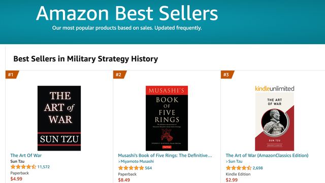 事实上,《孙子兵法》的传播广泛程度,远超于许多国内读者的想象。在亚马逊网站上,《孙子兵法》常年坐稳战争类图书销量榜首。