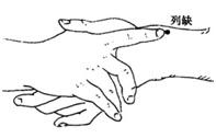 取穴:两手虎口自然交叉,一手食指按在另一手桡骨茎突上,指尖下凹陷中。