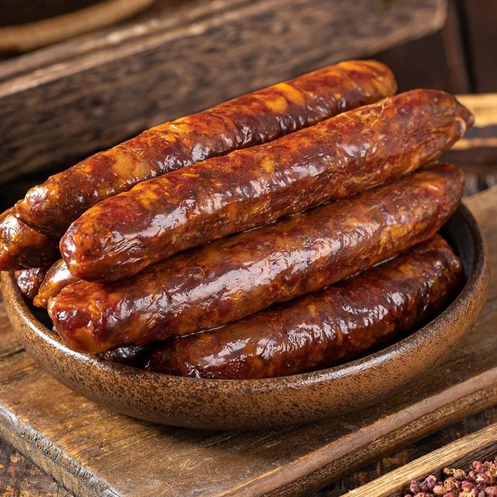 趁热空口吃,还会biu出肉汁,连带着咬破肠衣的清脆,经过烟熏的迷人香气带着五香、麻辣刺激味蕾,鲜香中带着油润,更绝的是吃完满嘴都是肉香。