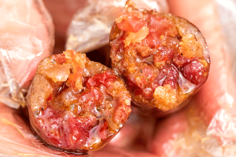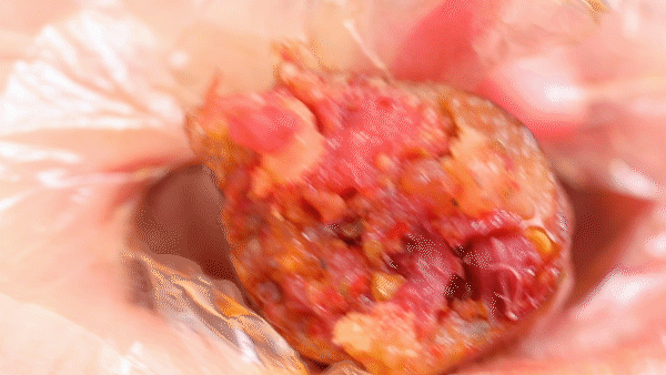 再按照古法“石缸湿腌法”,让肉始终保持在3℃~4℃的温度中,充分吸收香料的味道,再灌进天然黑猪肠衣里。