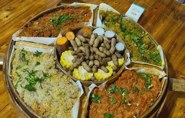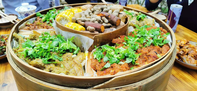 这道菜以粉蒸肉为主打,里面配有蒸牛肉、蒸五花等肉菜,还有南瓜、土豆、花生等素菜。一道吃尽所有粉蒸菜!