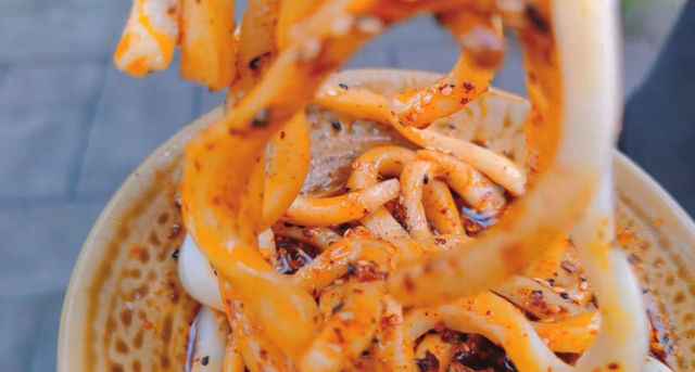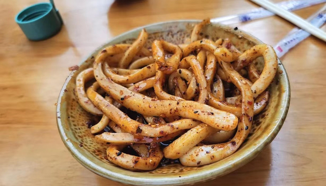 如同筷子一般粗的甜水面,是成都蒲江的一道名小吃。红油辣椒、复刻酱油配上少许白砂糖,吃起来微甜麻辣有嚼劲。
