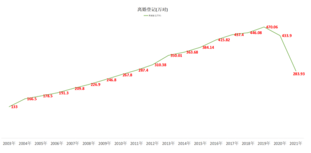 ↑2003年至2021年全国离婚登记曲线图 据国家统计局