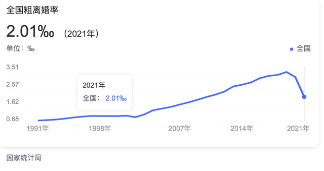 不过,红星新闻记者也注意到,2019年后,我国离婚率逐渐走上了下坡路。到2020年,离婚登记从超470万对降至433.9万对,粗离婚率回落至3.09‰;2021年则降至283.93万对,粗离婚率下降到2.01‰。
