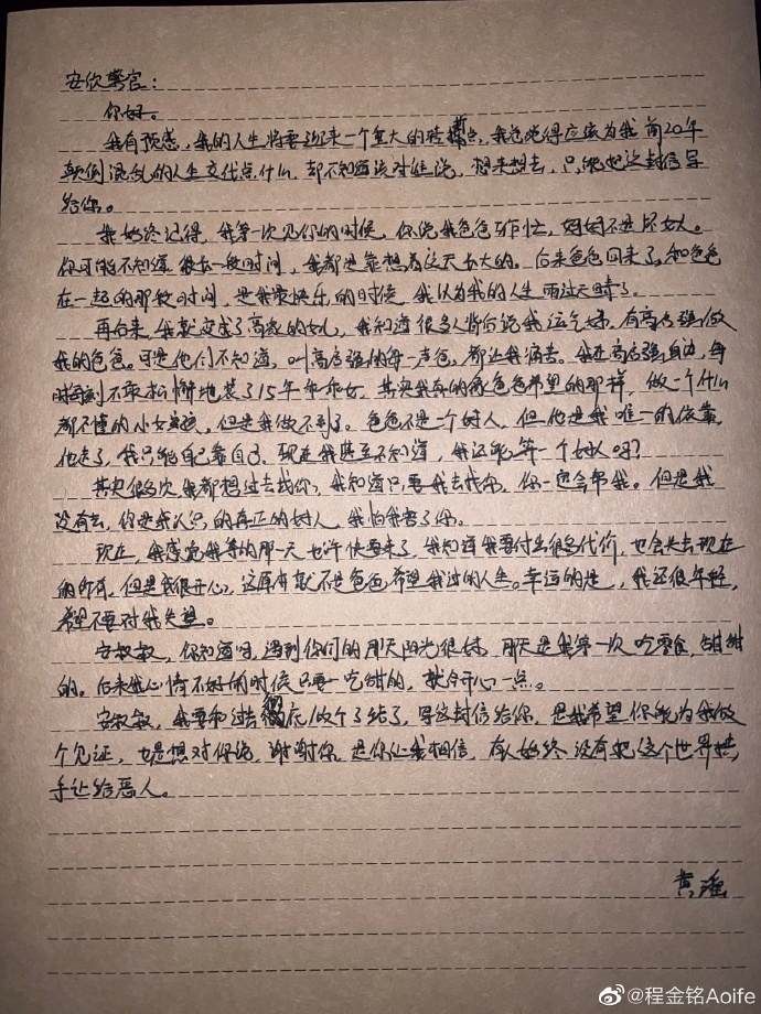 值得注意的是,剧中黄瑶的扮演者程金铭在个人微博以黄瑶给安欣警官的一份信的方式告别《狂飙》。
