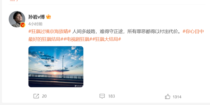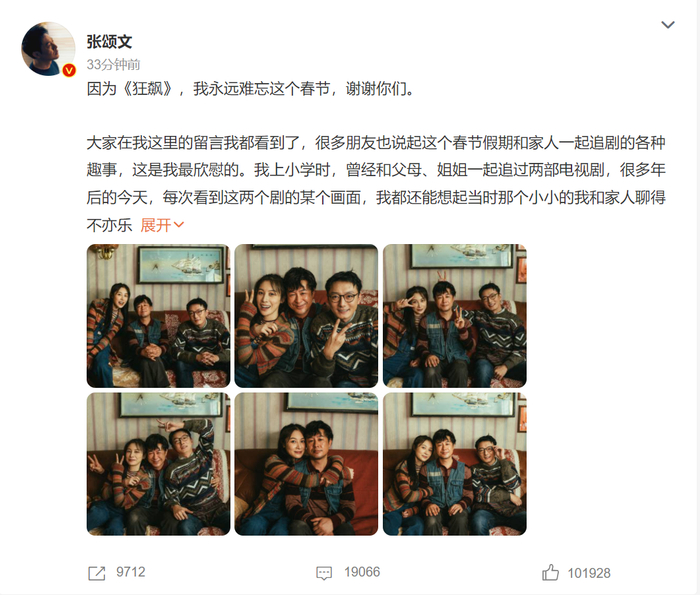 大家在我这里的留言我都看到了,很多朋友也说起这个春节假期和家人一起追剧的各种趣事,这是我最欣慰的。我上小学时,曾经和父母、姐姐一起追过两部电视剧,很多年后的今天,每次看到这两个剧的某个画面,我都还能想起当时那个小小的我和家人聊得不亦乐乎的画面,它是如此清晰、如此温暖。在未来,聊起往事,聊起2023年,希望有人能记得在2023年的春节,有过一部叫作《狂飙》的电视剧……作为影视工作者,我们会深感荣幸、自豪。