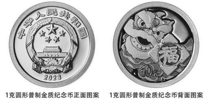 该套金银纪念币正面图案均为中华人民共和国国徽,并刊国名、年号“2023”;背面图案均为“福”字和舞狮造型等组合设计,并刊面额。双色铜合金纪念币正面图案为“中国人民银行”“10元”字样,底纹衬以团花图案;背面主景图案为中国传统剪纸艺术与装饰年画元素相结合的兔子形象,衬景图案为花灯和桂枝、桂花,币面左侧刊“癸卯”字样。